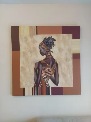 Este set de dos cuadros aporta un toque artístico y étnico a tu hogar. Cada pieza presenta una figura femenina con vestimenta y adornos inspirados en la cultura africana, sobre un fondo texturizado. - Marco de madera con detalles en tonos tierra. - Lienzo impreso con acabado mate.