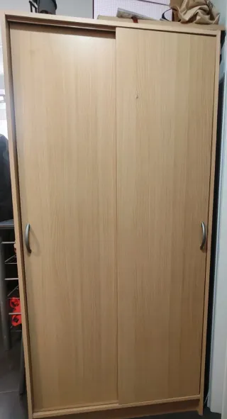 Armario de dos puertas con un diseño moderno y funcional. - Acabado en tonos beige y marrón. - Fabricado en madera de calidad. Está en un 3 sin ascensor, desmontar o bajar por cuenta del comprador.