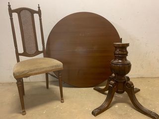 Se vende mesa de comedor de madera con pie repujado y sillas con respaldo antiguo de rejilla labrada en buen estado. La mesa se puede abrir para más comensales. Actualmente mesa desmontada para su mejor transporte. Gran Canaria