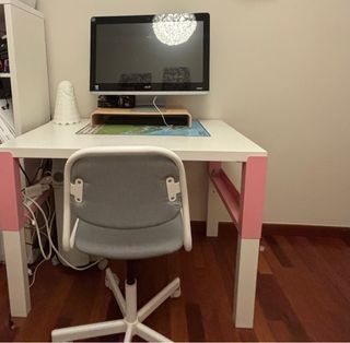 Mesa de estudio de madera con un diseño moderno y funcional. - Patas con detalle en color rosa. - Superficie amplia para trabajar o estudiar. Tiene pegamento pegado en la esquina izquierda como una línea pequeña, puse la foto,yo no he probado a darle con ningún producto por si se cala pintura, por lo demás está perfecta