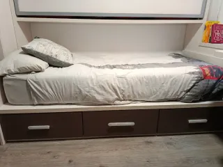 Conjunto de cama abatible y cama fija. - Estructura de madera color beige claro y marrón 200*98 - cama abatible de 90*200 -Cama fija de 90*200 -Tres Cajones de 65*25