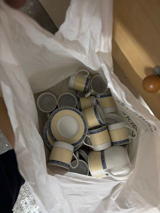 Conjunto de tazas de café y tetera con un diseño elegante. - Tazas con detalles en azul y amarillo. - Platos a juego. - Tetera a juego.