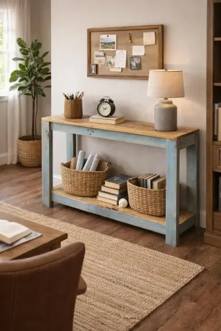 Consola de madera reciclada con un acabado desgastado en tono azul cielo y detalles en madera natural. Perfecta para añadir un toque rústico y encantador a tu recibidor o salón. -Se fabrica a medida - Diseño de dos niveles para almacenamiento adicional. - Patas robustas para mayor estabilidad.