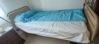 Cama asistencial articulada con estructura de madera y metal. - Colchón azul. - Laterales de madera. - Base metálica.