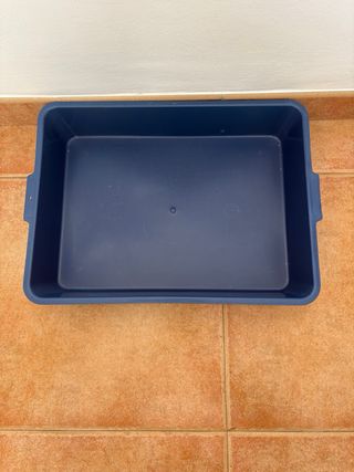 Arenero de plástico resistente para gatos. Su diseño es práctico y fácil de limpiar. - Color azul. - Bordes elevados para contener la arena. - Asas laterales para facilitar su transporte.