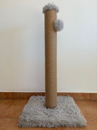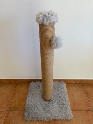 Rascador para gatos con base de alfombra y una “pelota” colgante. - Columna forrada de cuerda de sisal. - Base de alfombra suave. - Una “pelota” decorativa colgantes.