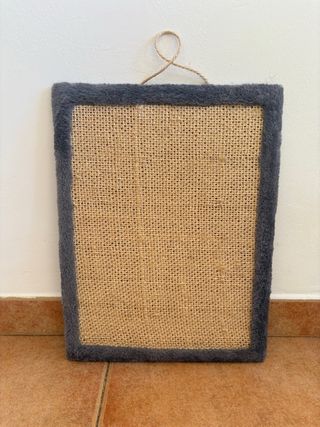Rascador para gatos con un diseño sencillo y natural. - Borde de felpa gris. - Cuerda para colgar.