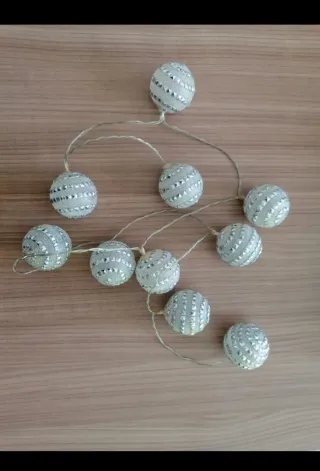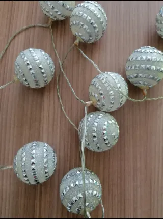 Tira de 10 bolas de Navidad, 1.35m de largo. Detalles plateados brillantes. También se pueden cortar y ponerlas por separado. Tira de 10 boles de Nadal de color brillant platejat de Llargada de 1.35m. Possibilitat de fer entregues en mà a Llagostera, Caldes Malavella, Sils, Vidreres i Sta Coloma de Farners.