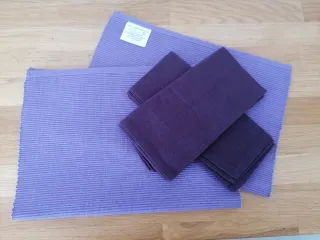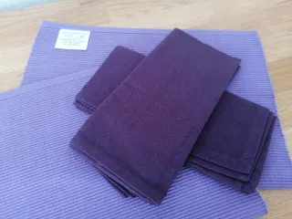 Conjunto de 2 manteles individuales y servilletas en tono morado. - 2 manteles individuales de tela de algodón 100%, 46x34cm. Como nuevos. Fabricado en Índia. - 2 servilletas de tela a juego, algodón 100%, 45x42cm. Nuevas. Lot de 2 estovalles individuals i 2 tovallons de color lila-morat. Estovalles Com noves i tovallons totalment nous. Possibilitat de fer entregues en mà a Llagostera, Sils, Caldes Malavella, Vidreres i Sta Coloma de Farners.