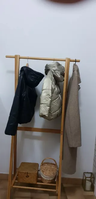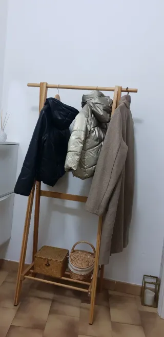 Este perchero de madera con detalles en mimbre es un práctico mueble auxiliar.