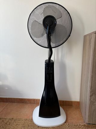 Ventilador de pie con nebulizador, que funciona como climatizador de agua. - Base estable en color blanco. - Columna y rejilla en color negro. - Panel de control superior. Ofrece tres modos de funcionamiento para el ventilador y permite inclinarse hacia arriba o hacia abajo. Incluye función de oscilación para distribuir el aire. Está equipado con ruedas para facilitar su desplazamiento. 40x120x40