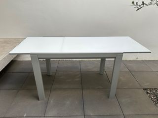 Mesa de comedor moderna con un diseño limpio y funcional. Marca Ondarreta, modelo Siena - Tablero blanco de cristal - Patas y estructura gris de madera. - Diseño extensible para mayor capacidad (110x70 y 170x70 extendida) Una de las sillas tiene el asiento un poco estropeado. Una de las patas de la mesa también está un poco estropeada La mesa se entrega desmontada. Con las instrucciones y los tornillos.