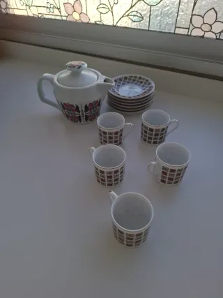 Precioso juego de té con un diseño floral muy delicado. - Incluye tetera y varias tazas. - Decoración floral en tonos rojos y rosas. - Acabado brillante. Precio negociable