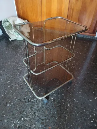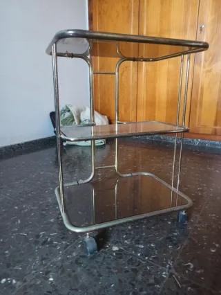 Mesita auxiliar con estantes de cristal y estructura metálica. - Diseño moderno y funcional. - Tres niveles para almacenamiento. - Ruedas para fácil movilidad.