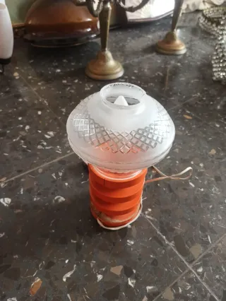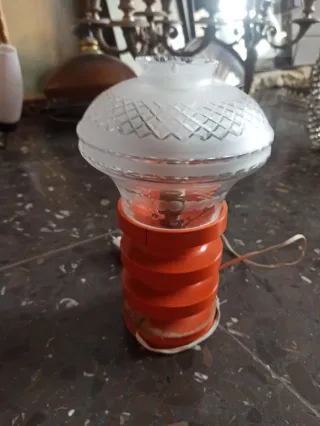 Pequeña lámpara de mesa con un diseño retro y encantador. - Base en color naranja. - Pantalla de cristal con relieve. - Cable de conexión incluido.
