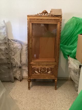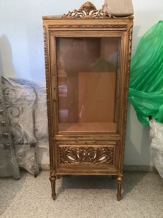 Dos Elegantes vitrinas de estilo italiano con detalles dorados con cajón - dos baldas de cristal - Fabricada en madera y cristal. - Diseño clásico y ornamentado. - Acabado en color dorado.