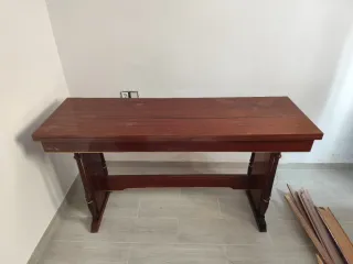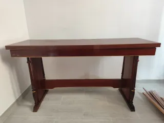 Elegante mesa de comedor con un acabado de madera oscura y detalles dorados. - Diseño clásico y robusto. - Patas torneadas con adornos dorados. - Tablero rectangular con bordes suaves. Está en muy buen estado, lo único que tiene es un poco agrietado un ala al abrirla como se ve en las fotos, de ahí su precio. Medidas: -cerrada: 48cm ancho x 150cm largo x 80cm alto -abierta: 96cm ancho