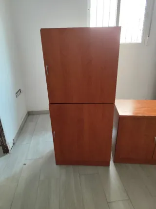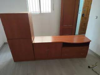 Mesa para televisión + mueble auxiliar con diseño moderno y funcional, ideal para complementar tu espacio. - Cuenta con dos puertas y dos cajones para almacenamiento. - Superficie superior con forma curva. Medidas: -Mueble TV 160cm ancho x 63cm alto x 42cm profundo (50cm en la parte más sobresaliente) -Mueble auxiliar 2 puertas 60cm ancho x 137cm alto x 40cm profundo Estan en muy buen estado, los vendo por cambio de mobiliario. Conjunto por 50€, vendidos por separado 30€/unidad.