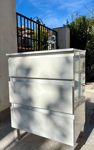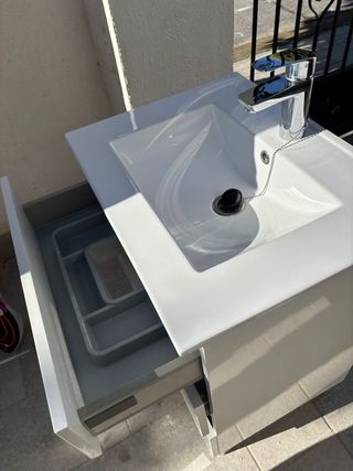 Vendo mueble de baño completo, en muy buen estado y listo para instalar. Incluye lavabo cerámico y grifo de alta calidad Ramón Soler, ambos en perfecto funcionamiento. Características del conjunto: - Mueble de baño moderno con tres cajones amplios y de cierre suave. - Acabado blanco brillante, muy elegante y fácil de limpiar. - Lavabo cerámico con líneas actuales, sin golpes ni grietas. - Grifo Ramón Soler cromado, en excelente estado. - Cajón superior con organizadores internos.