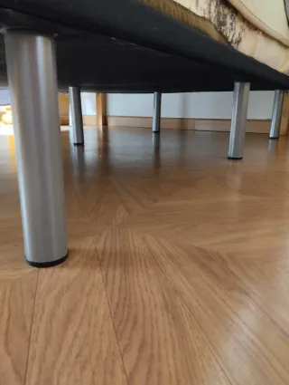 Elegante mesa camilla con tapa de cristal y estructura cubierta de tela gris. - Diseño moderno y funcional. - Cubierta de tela con acabado texturizado. - Superficie de cristal transparente. Refuerzo de metal en borde de tarima. BRASERO NO INCLUIDO pintada en negro. Tarima azul. Pequeño toque en cristal que no hace roce La ropa está marcada del calor. De ahí si precio aunque ya sólo por el cristal merece la pena. Se puede entregar a partir del 5 de abril.