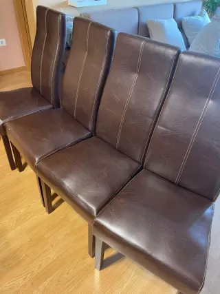 Conjunto de cuatro sillas de comedor con un diseño elegante y moderno. Son cómodas y aportan un toque sofisticado a cualquier comedor. - Tapicería de piel. - Costuras decorativas. - Patas de madera resistentes. Hay dos de ellas que tienen alguna marca de desgaste como se ve en las fotos . Por lo demás estan en buen estado