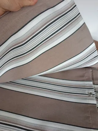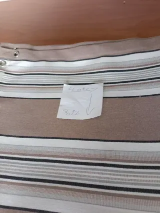 Lona de toldo con anillas a todo alrededor (los 4 lados) a una distancia de unos 50 cm aproximadamente unas de otras, medida de 4x3,12 ( dirección de las rayas indicada en las fotos mediante un papel con flechas) Tejido recubierto de teflón repele el agua y la suciedad transmite menos calor que los convencionales , etiqueta del tejido en las fotos. Ideal para sombrajes pérgola avance patio jardín y terraza Más medidas y colores en mi perfil