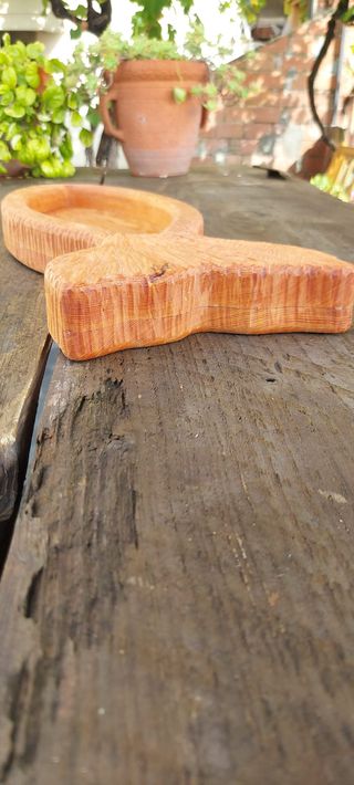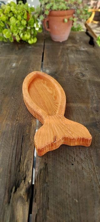 Bandeja decorativa y funcional en **forma de pez**, realizada **a mano en madera natural**. Cada pieza es única, con **texturas trabajadas artesanalmente** que realzan el carácter y la veta de la madera. Acabada con **aceite mineral y cera de abeja**, **apta para uso alimentario**, ideal para servir aperitivos, pan o como pieza decorativa en cocina o mesa. Un objeto sencillo, natural y con alma artesanal. 💰 **Precio no negociable.** 🧾 **Se emite factura en cada compra.**