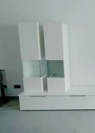 Mueble de almacenamiento Besta de Ikea. Su diseño moderno y limpio se adapta a cualquier estancia. Se pueden poner un al lado del otro para mueble tv, yo los tengo uno encima de otro. - Puertas blancas brillantes - Dos módulos, con dos estantes - Unas de las bisagras son de cierre despacio - Medidas en la foto (modulo individual) - Precio todo