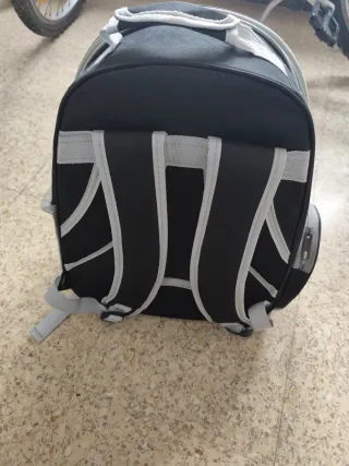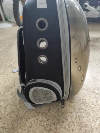 Mochila transportín para gatos, ideal para viajes o paseos. Su diseño es moderno y funcional. - Color negro y gris. - Correa de sujeción - Bolsillo lateral con cremallera. Nunca la usé debido a que equivoqué la talla .