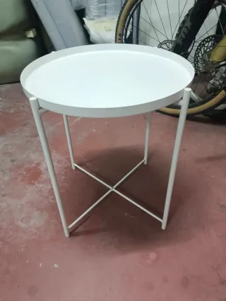 Mesa auxiliar de diseño moderno con superficie redonda. - Patas metálicas cruzadas para mayor estabilidad. - Acabado liso y uniforme.
