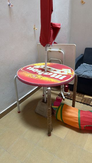 Conjunto de mesa y sillas de plástico con el logo de Mahou. - Sillas apilables. - Diseño llamativo.