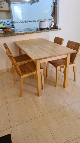 Conjunto de mesa de comedor con cuatro sillas a juego. Ideal para crear un espacio acogedor. - Mesa con superficie de madera clara. - Sillas con estructura de madera y asientos de mimbre tejido.