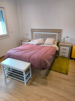 Conjunto de muebles de habitación en excelente estado, casi sin uso. Comprados hace un año - Cabecero de cama con diseño moderno. - Mesitas de noche a juego. - Cómoda con cajones. - Banco a pie de cama. Incluye colchon tb comprado todo el mismo dia,vamos que esta nuevo