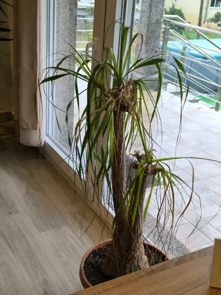 Planta de interior con tronco leñoso y hojas largas y colgantes, similar a una palmera. Ideal para dar un toque exótico a tu hogar. - Tronco con textura. - Hojas verdes y alargadas.