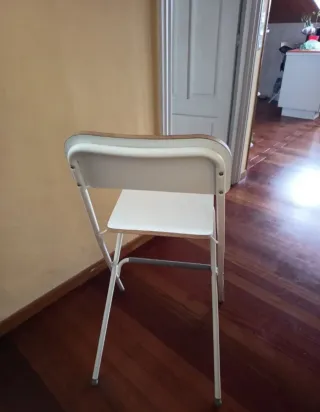 Conjunto de sillas altas plegables de IKEA. Son prácticas y fáciles de guardar. - Estructura de metal. - Asiento y respaldo de madera. - Acabado en blanco. - 10 € cada una. - 2 unidades disponibles.