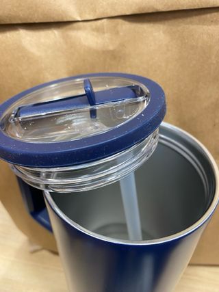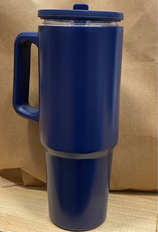 Vaso térmico de acero inoxidable con tapa de rosca y asa, ideal para llevar tus bebidas a la oficina o al gimnasio. Su capacidad es de 750ml. - Diseño moderno y funcional. - Incluye tapa para mantener la temperatura.
