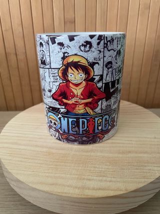 Taza con diseño del anime One Piece. - Ilustración de Monkey D. Luffy. - Fondo con viñetas de manga. - Logo de One Piece.