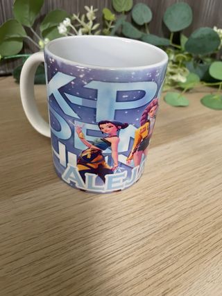 Taza con un diseño vibrante inspirado en el K-Pop, mostrando personajes animados. - Diseño de personajes de K-Pop. - Fondo estrellado y galáctico.