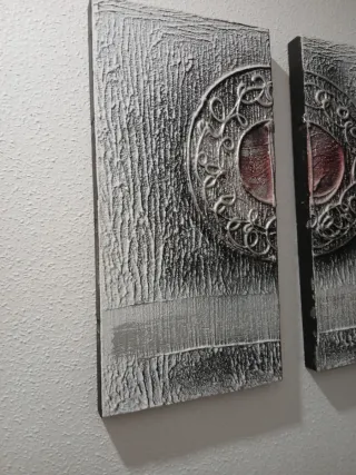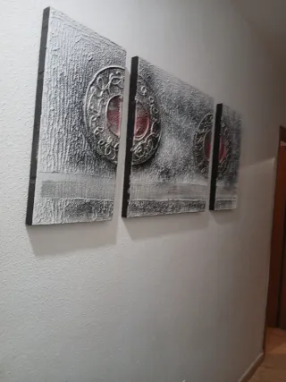 Conjunto de tres cuadros modernos con un diseño abstracto y elegante. Se pueden colgar igual que la foto o más juntos quedan bonitos en los dos casos - Cada cuadro presenta un detalle circular en relieve con tonos rojos. - Marco exterior en color negro.