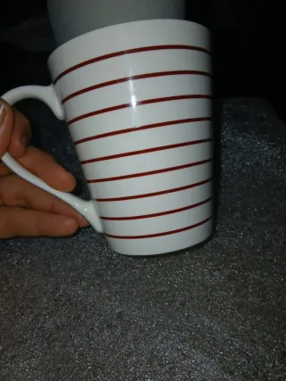 Taza de cerámica con un diseño alegre y motivador. - Diseño de rayas rojas sobre fondo blanco. - Mensaje Be Happy en color rojo.