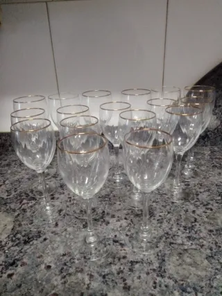 Elegantes copas de cristal con un delicado borde dorado. - Diseño clásico y refinado. - Aportan un toque de distinción a la mesa.