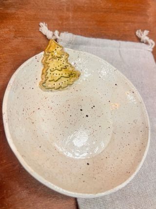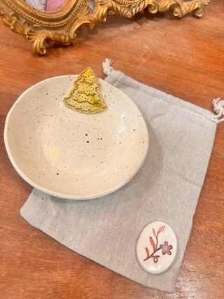 Precioso plato artesanal de ceramica - Diseño único. - Acabado en cerámica con motas. - Incluye una bolsita de tela con adorno también de cerámica artesana Ideal para adornar cualquier estancia de la casa