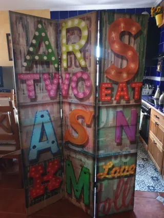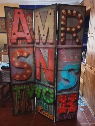 Precioso biombo decorativo con un diseño original y llamativo. - Medidas: 1,80m de alto x 40cm (cada panel). - Compuesto por 3 paneles.