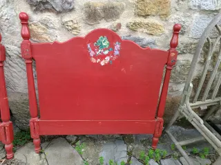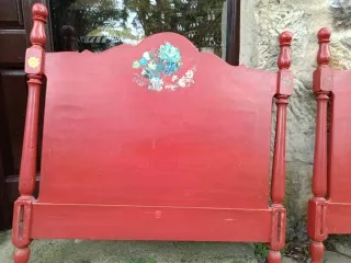 Conjunto de dos cabeceros de madera maciza con un diseño pintado a mano. - Pintura roja vibrante. - Detalle floral multicolor en uno de ellos. - Diseño clásico con postes torneados.