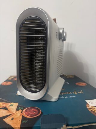 Calefactor y ventilador con un diseño moderno y funcional. - Acabado en color plateado y blanco. - Fabricado con materiales de metal y plástico.