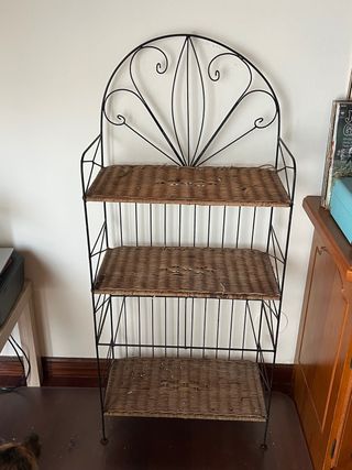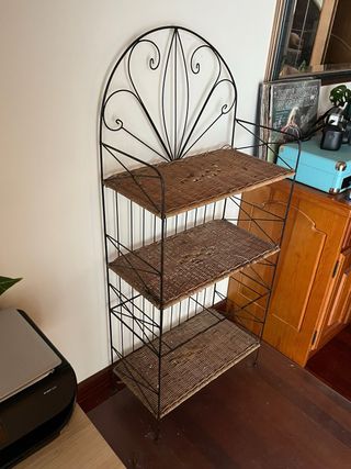 Elegante estantería de forja con tres baldas de mimbre. Su diseño combina la robustez del metal con la calidez del mimbre, aportando un toque rústico y decorativo a cualquier espacio. - Estructura de forja negra. - Tres baldas de mimbre. - Diseño con arco decorativo superior.