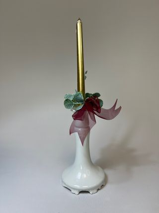 Antiguo candelabro de porcelana de Limoges, Francia. Decoración en relieve y base circular dentada. El candelabro evoca el estilo art déco de principios del siglo XX y el romanticismo. Dimensiones: altura: 17,5 cm, diámetro de la base: 10 cm, peso: 253 g. - Base de porcelana blanca. - Vela dorada incluida. - Adornado con hojas verdes y lazo burdeos.