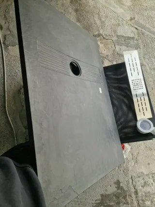 Plato de ducha de pizarra con desagüe y rejilla. (No se a usado nunca pero al estar guardado sin la caja tiene un par de rallones) - Medidas: 100 cm x 70 cm. - Acabado texturizado de granito - Incluye desagüe y rejilla metálica.