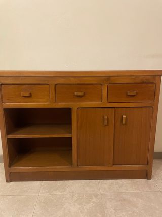 Mueble de madera con diseño clásico, ideal para recibidores o salones. - Tres cajones superiores. - Compartimento con dos puertas. - Estantería abierta con dos baldas.