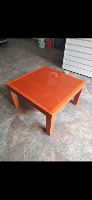 Mesa de centro cuadrada con un acabado en madera de color naranja. Madera maciza. - Diseño moderno y minimalista. - Patas robustas para mayor estabilidad.